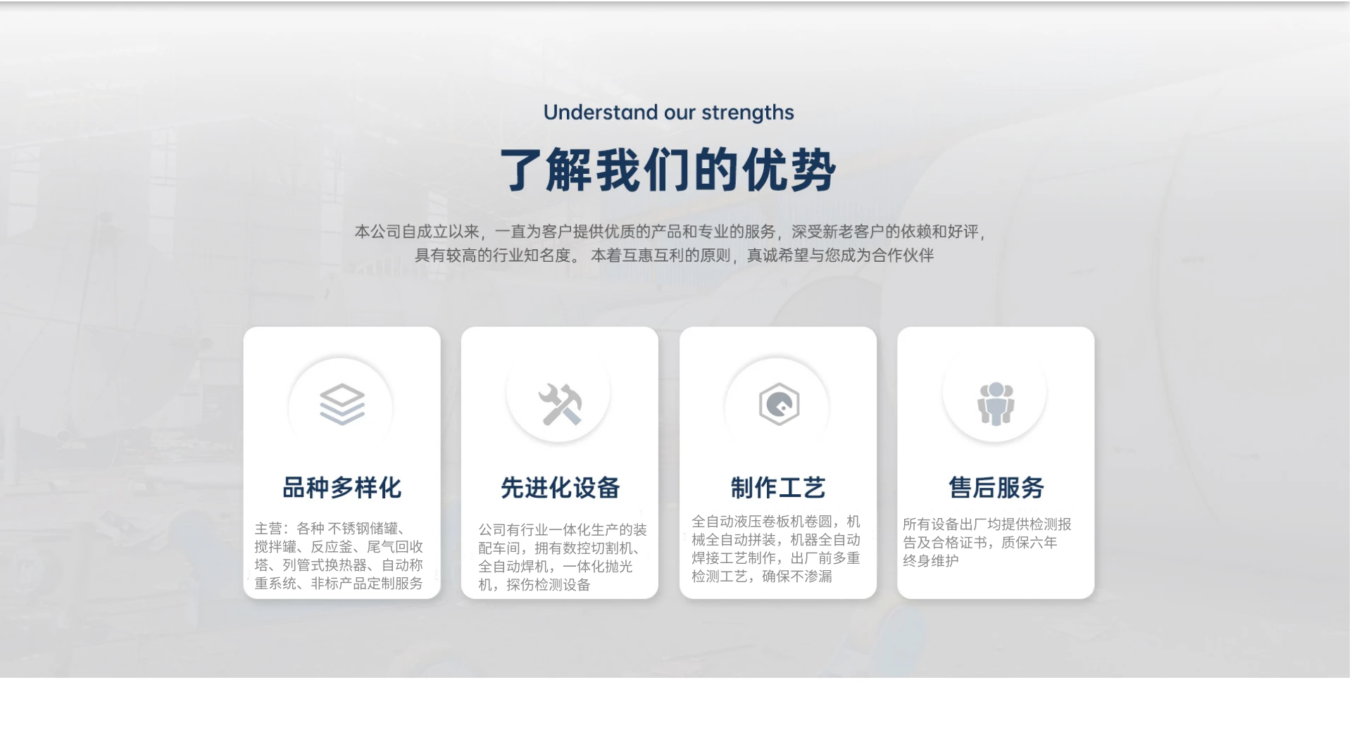主营产品反应釜,储罐,搅拌罐,尾气回收塔,列管换热器,自动称重系统,配料罐,中转罐,不锈钢储罐,移动罐,电池原料罐,前驱体生产线,前驱体设备,正极材料设备,动力电池设备,外盘管反应釜,夹套反应釜,高速分散釜,电加热反应釜,高温反应釜,高压反应釜,不锈钢搅拌罐,高速搅拌罐,高温搅拌罐,混合搅拌罐,电池原料搅拌罐,吨桶,不锈钢吨桶,锥形吨桶,方形吨桶,圆形吨桶,化工吨桶,化工设备,生物制药设备,液洗设备,涂料设备,树脂设备,高位槽,粉碎机,粉体搅拌罐